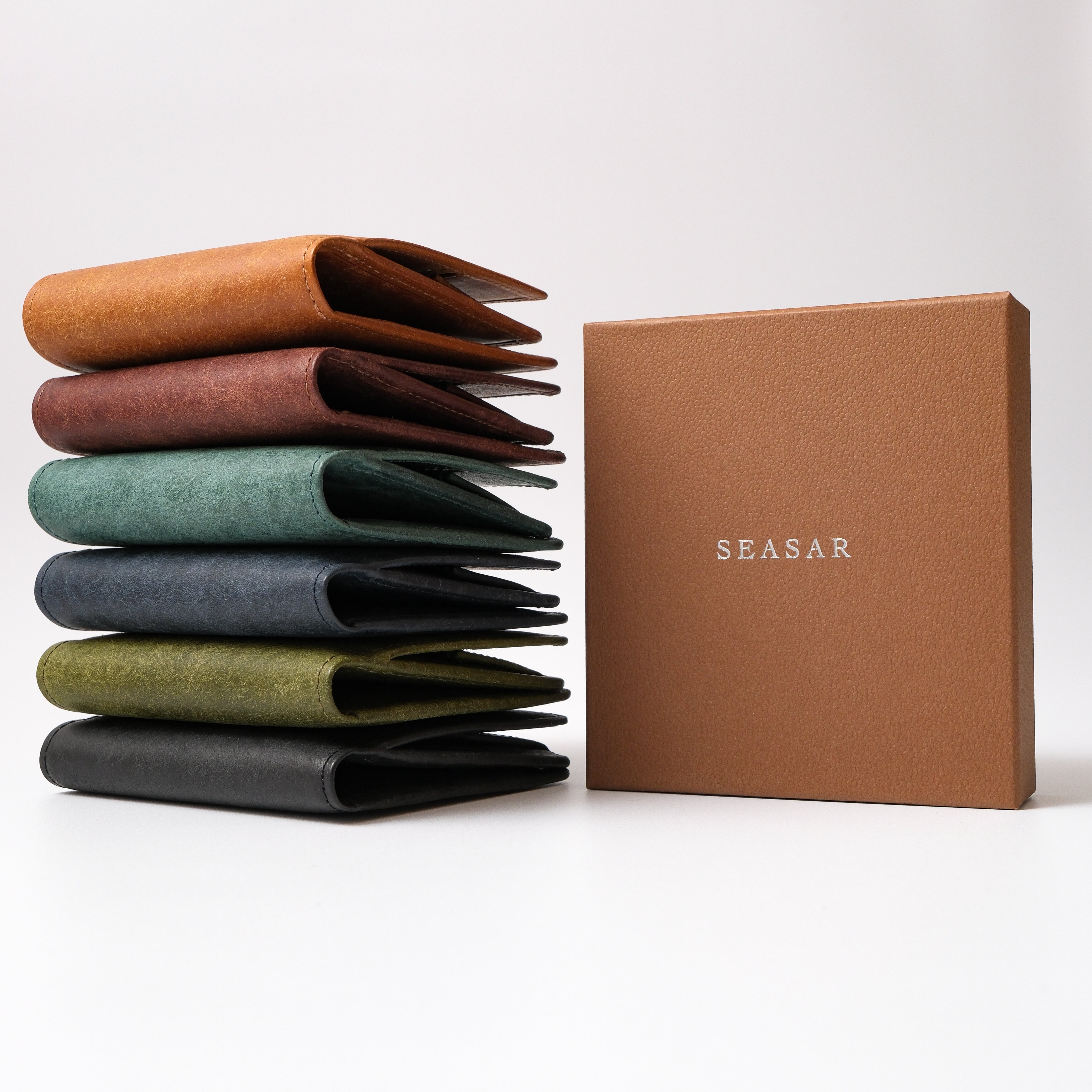 ご視聴いただき、誠にありがとうございます。わたくし、しーさーと申します。本日は、わたくしの自社ブランドSEASARより新たに発売いたします財布につきまして、初めて情報を公開させていただきます。その名も「Integral」、価格は税込28,600円でございます。発売は2月14日金曜日の18時を予定しております。本作は、プエブロレザーを使用し、高級感と使いやすさの両方にこだわった二つ折り財布です。