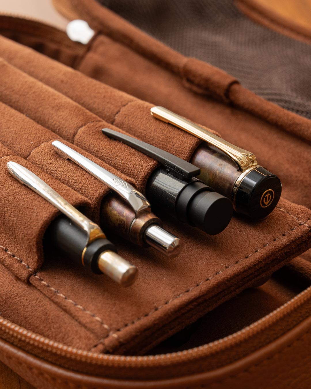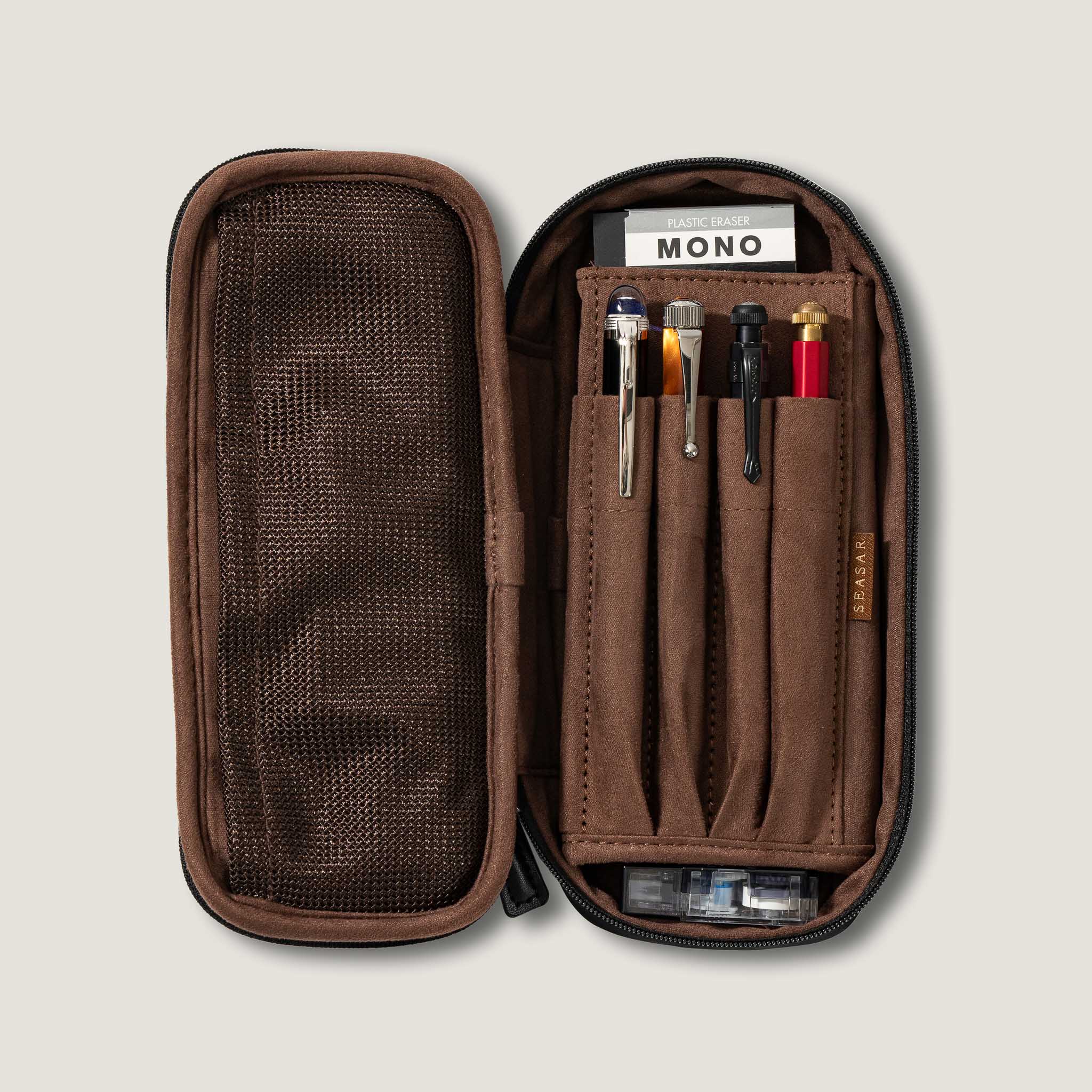 内装には一面スエード調生地を採用。ペンケースを開いた瞬間、上質な空間が広がり、大切なペンの美しさをより引き立てます。