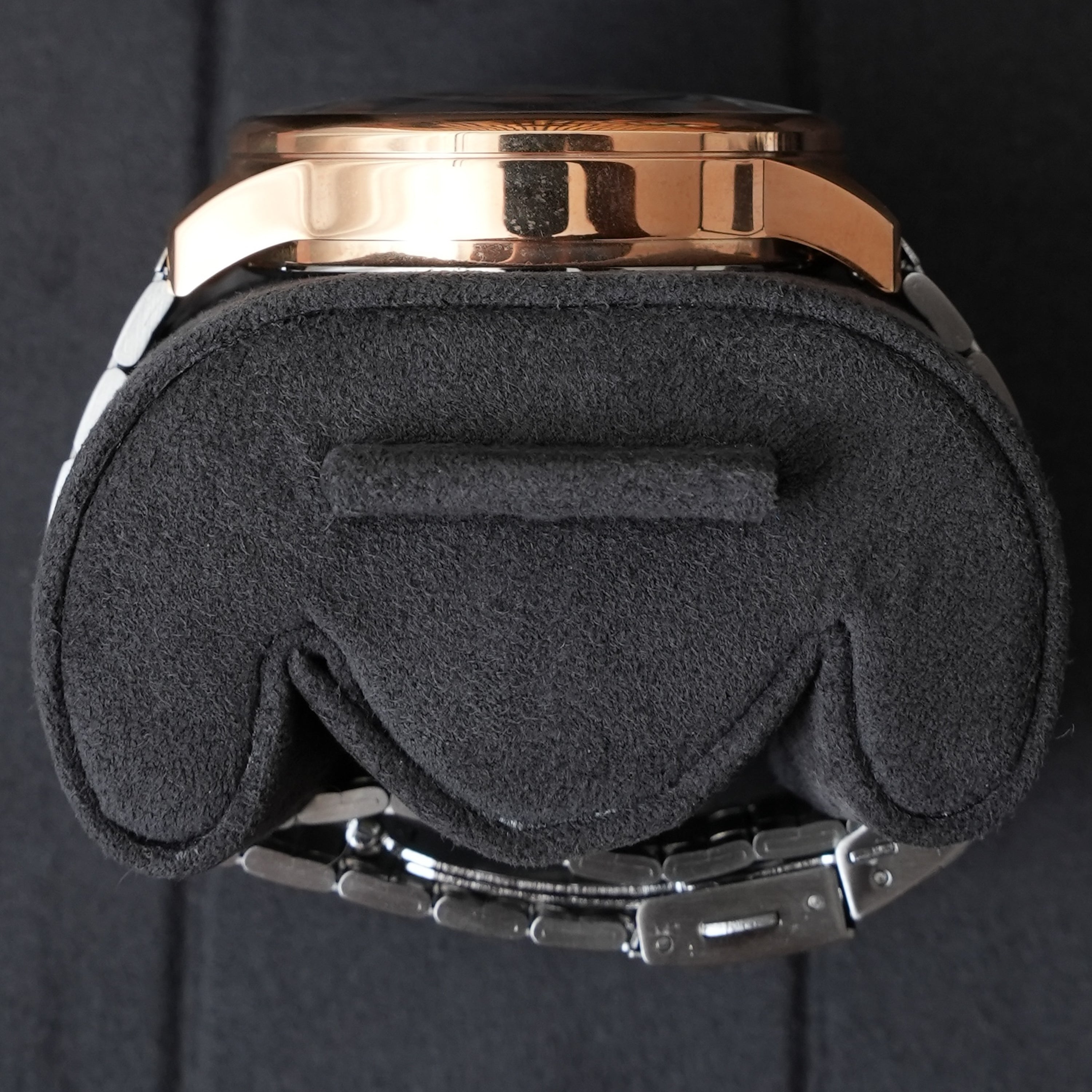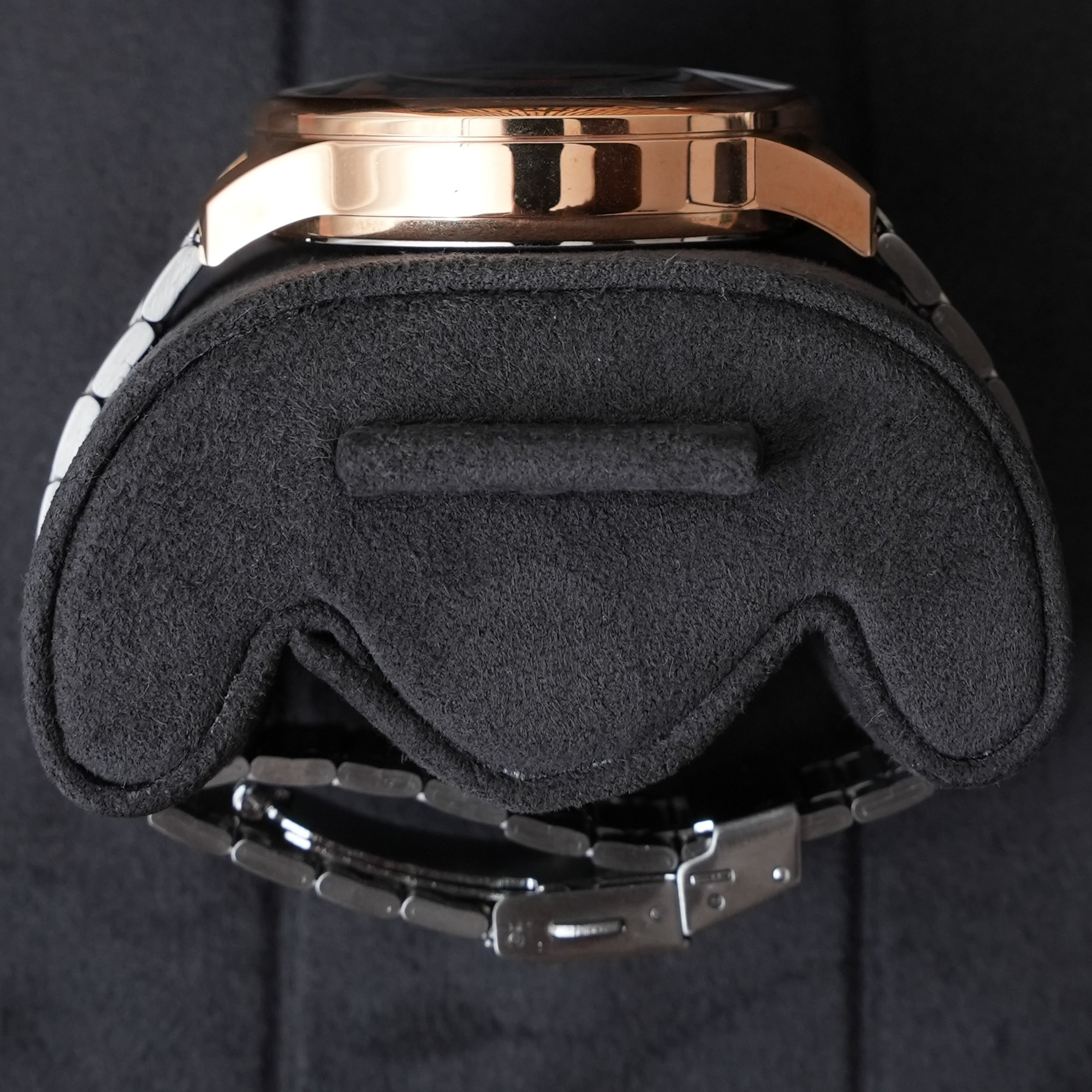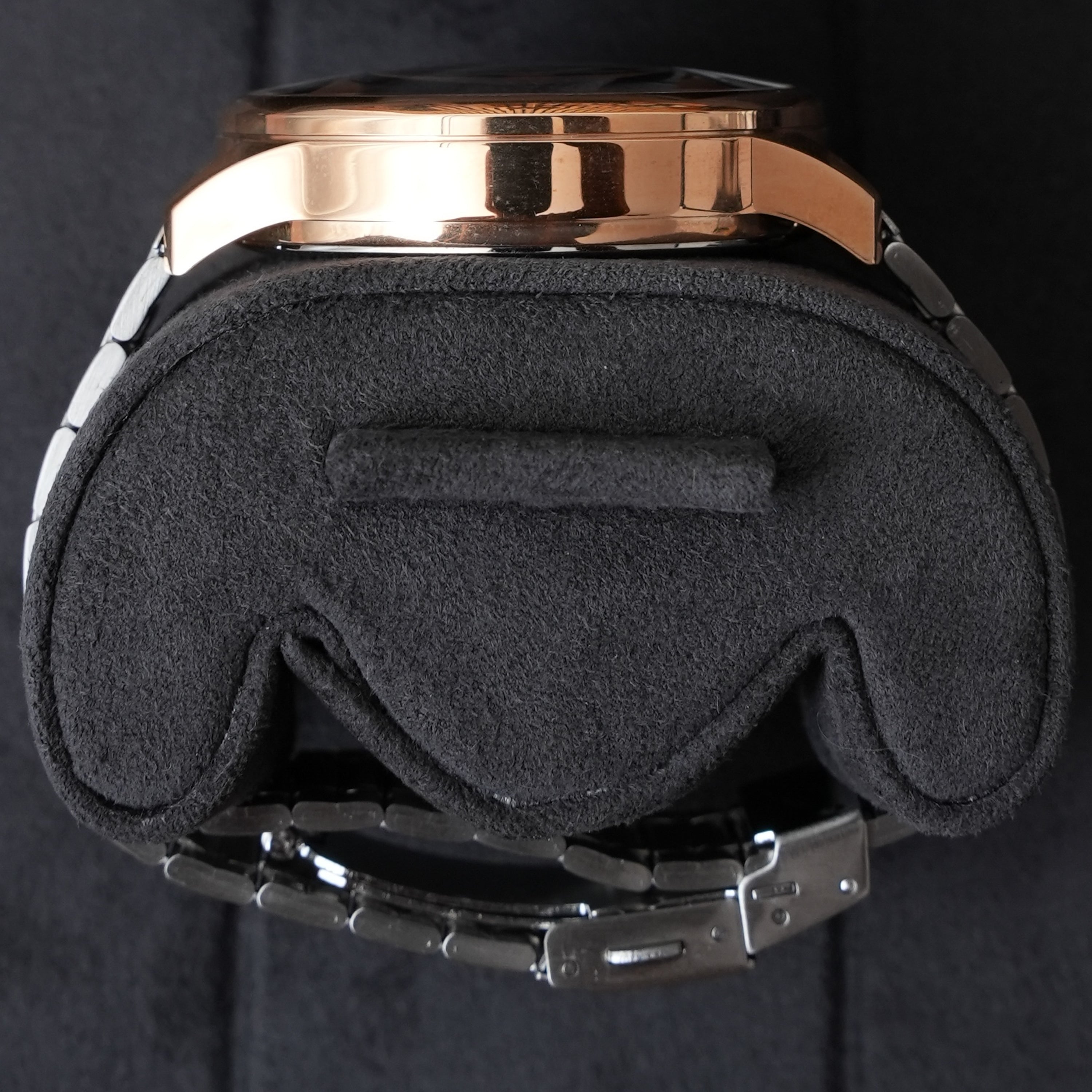 六角柱フォルム。パタンと開く蓋で腕時計を美しくディスプレイ。高級人工皮革「ウルトラスエード」を内装に全面使用。必要最小限のコンパクトなサイズ感。時計好きが設計した、時計好きのための腕時計ケース。